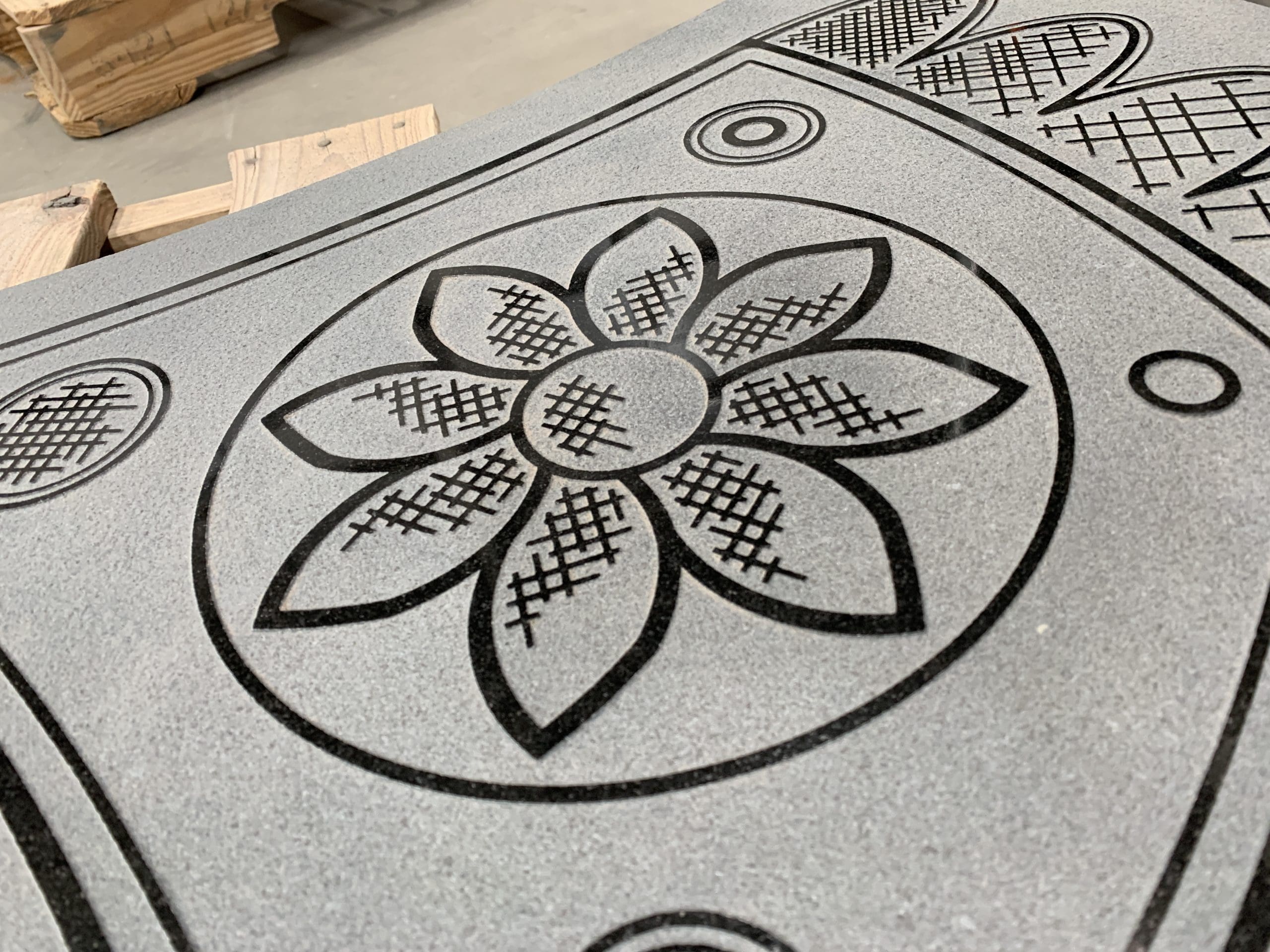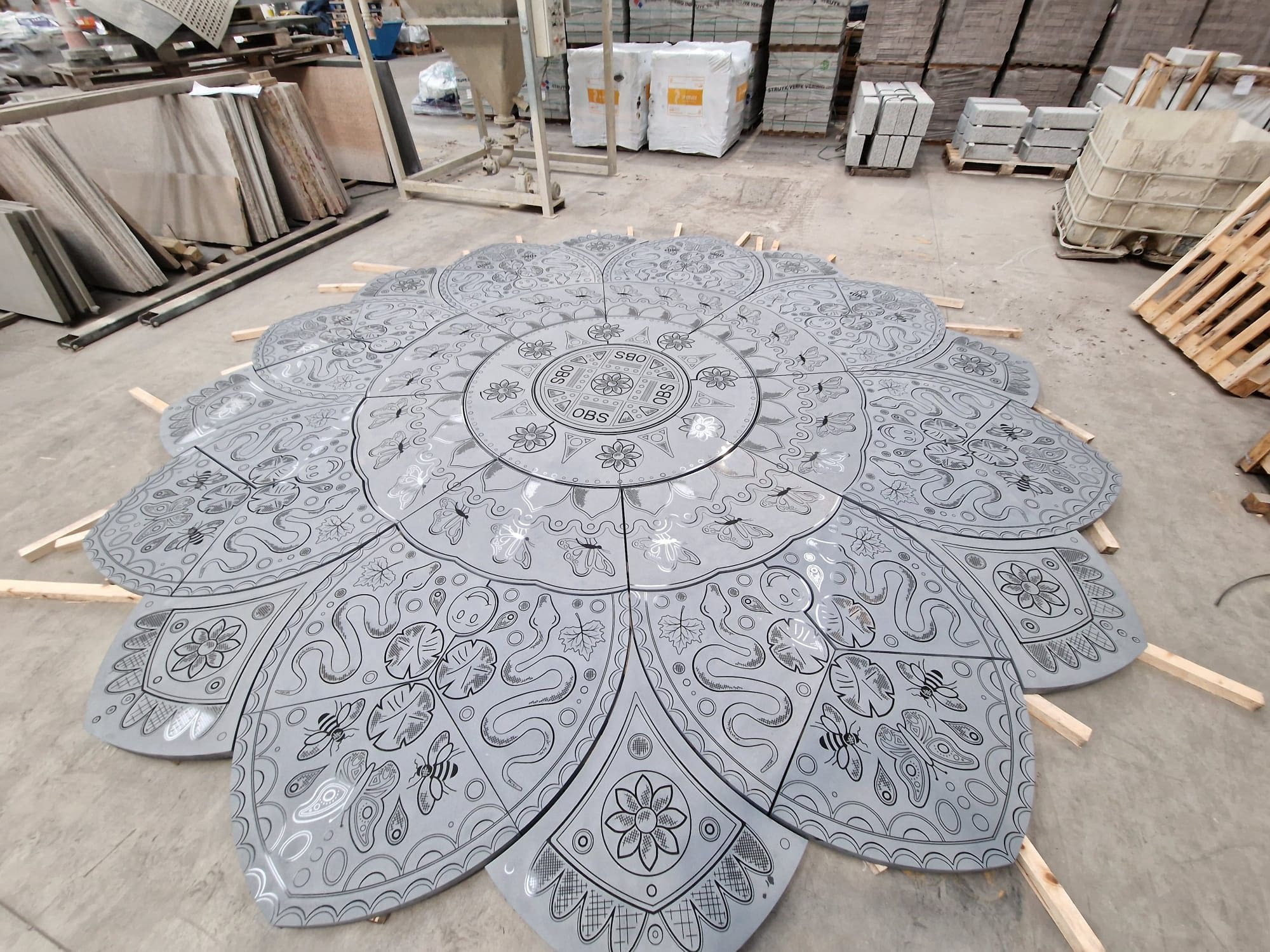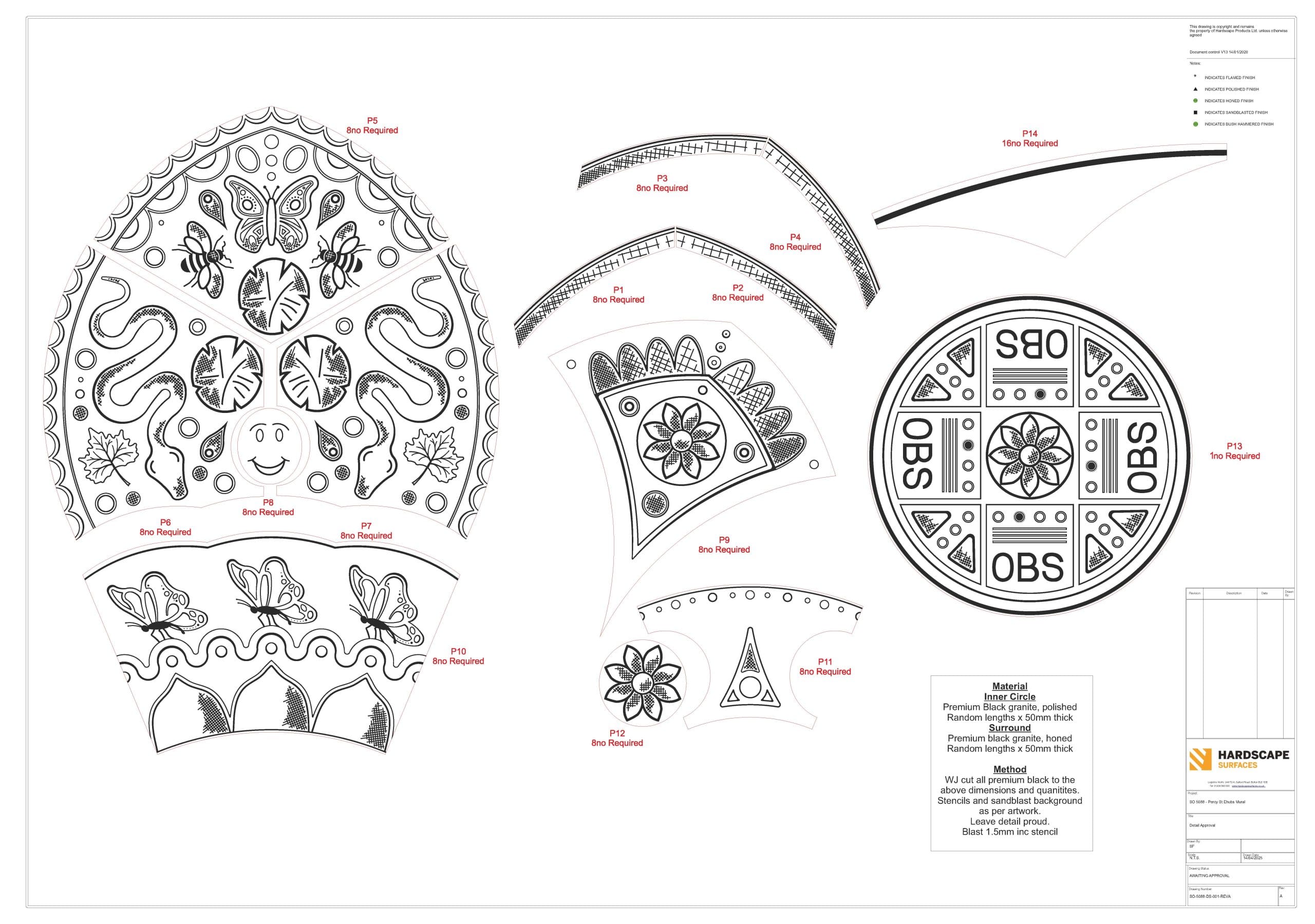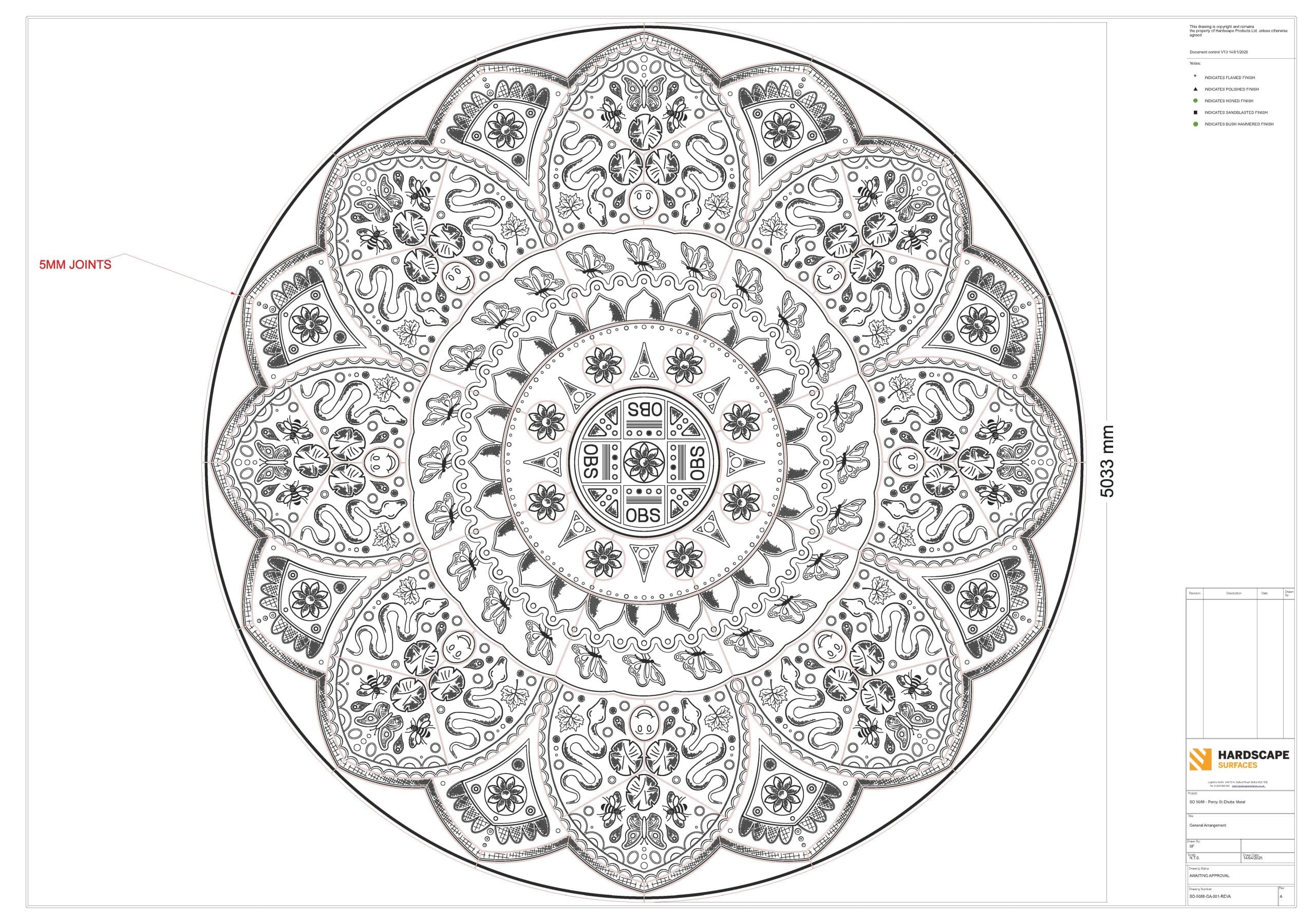 Hardscape Surfaces team developed full General Arrangement drawings for each section of the complex design, enabling meticulous planning of the layout, finishes and transitions. Skilled masons at our Hardscape Surfaces factory executed the design using a combination of Crystal Black and Royal White granites in polished, honed and sandblasted finishes. Stencil-based sandblasting highlighted intricate lines and patterns, creating the graphic contrast required by the design. Manufacturing and finish were supported by our CAD and production teams to ensure accuracy and continuity.