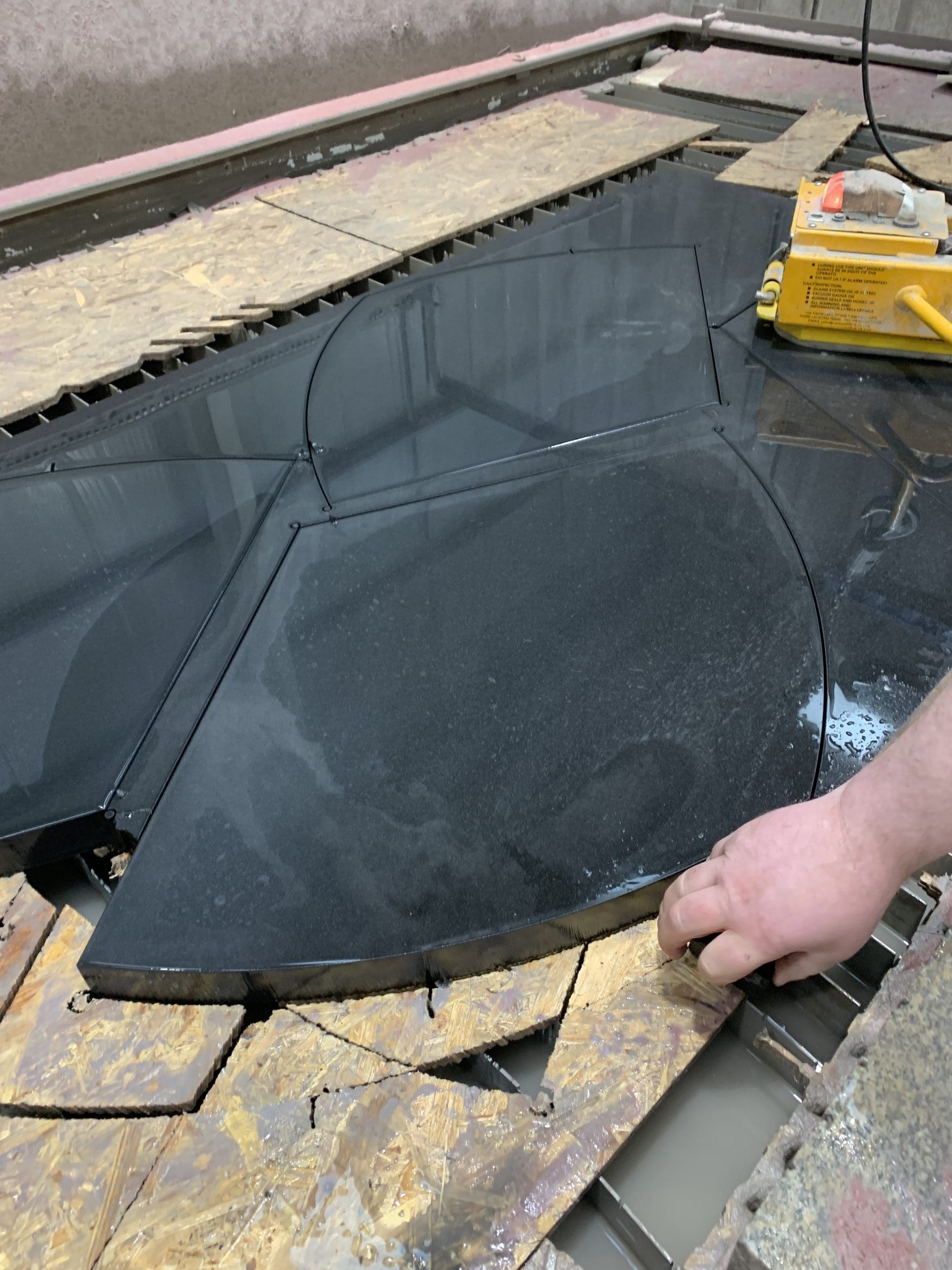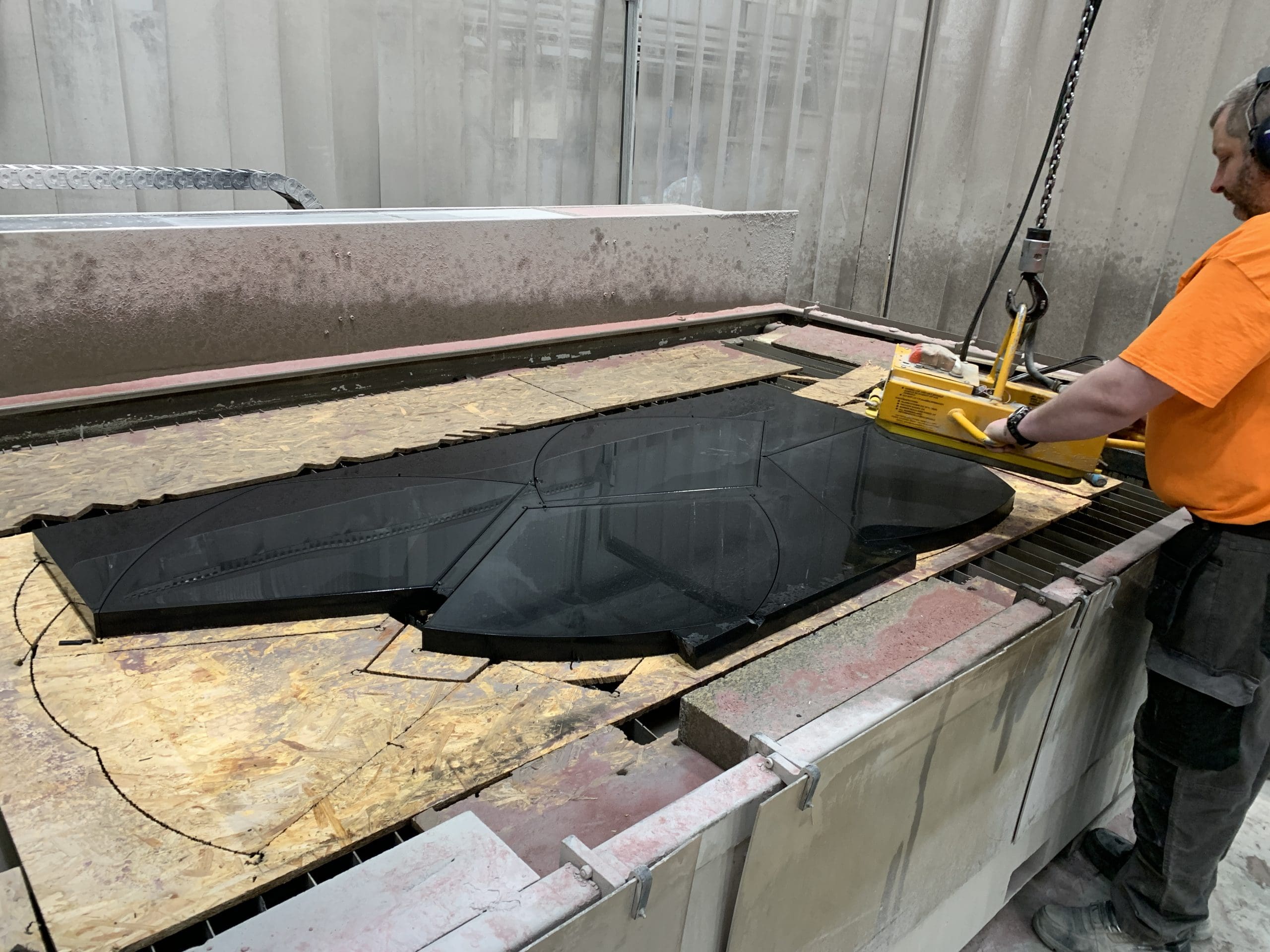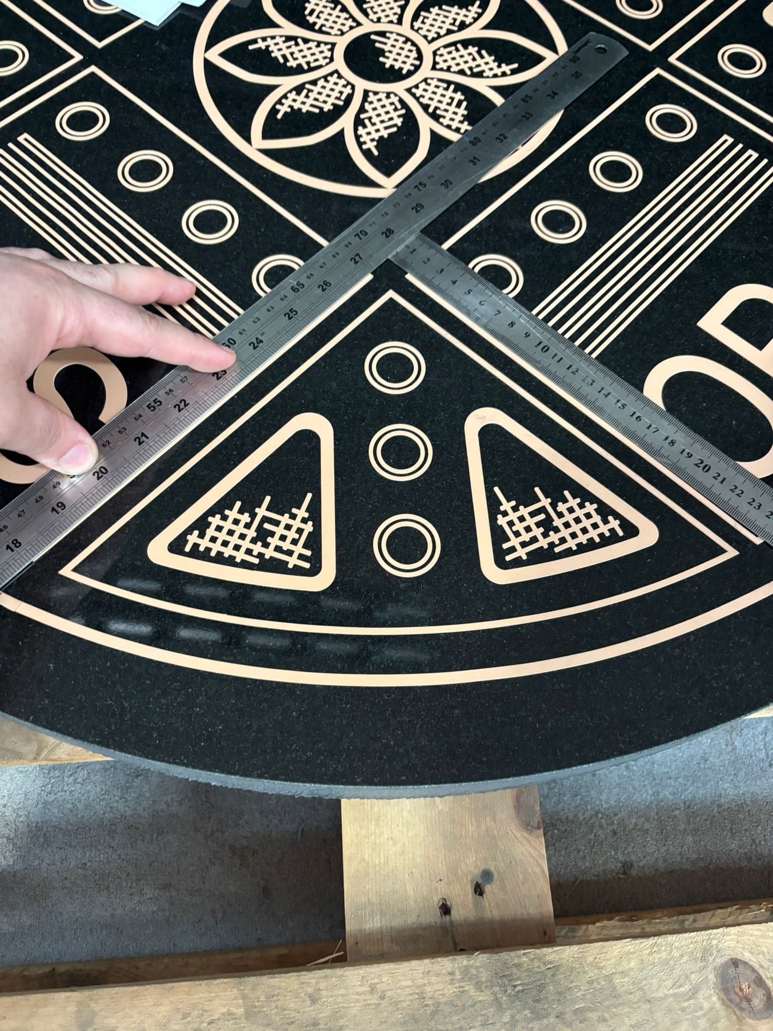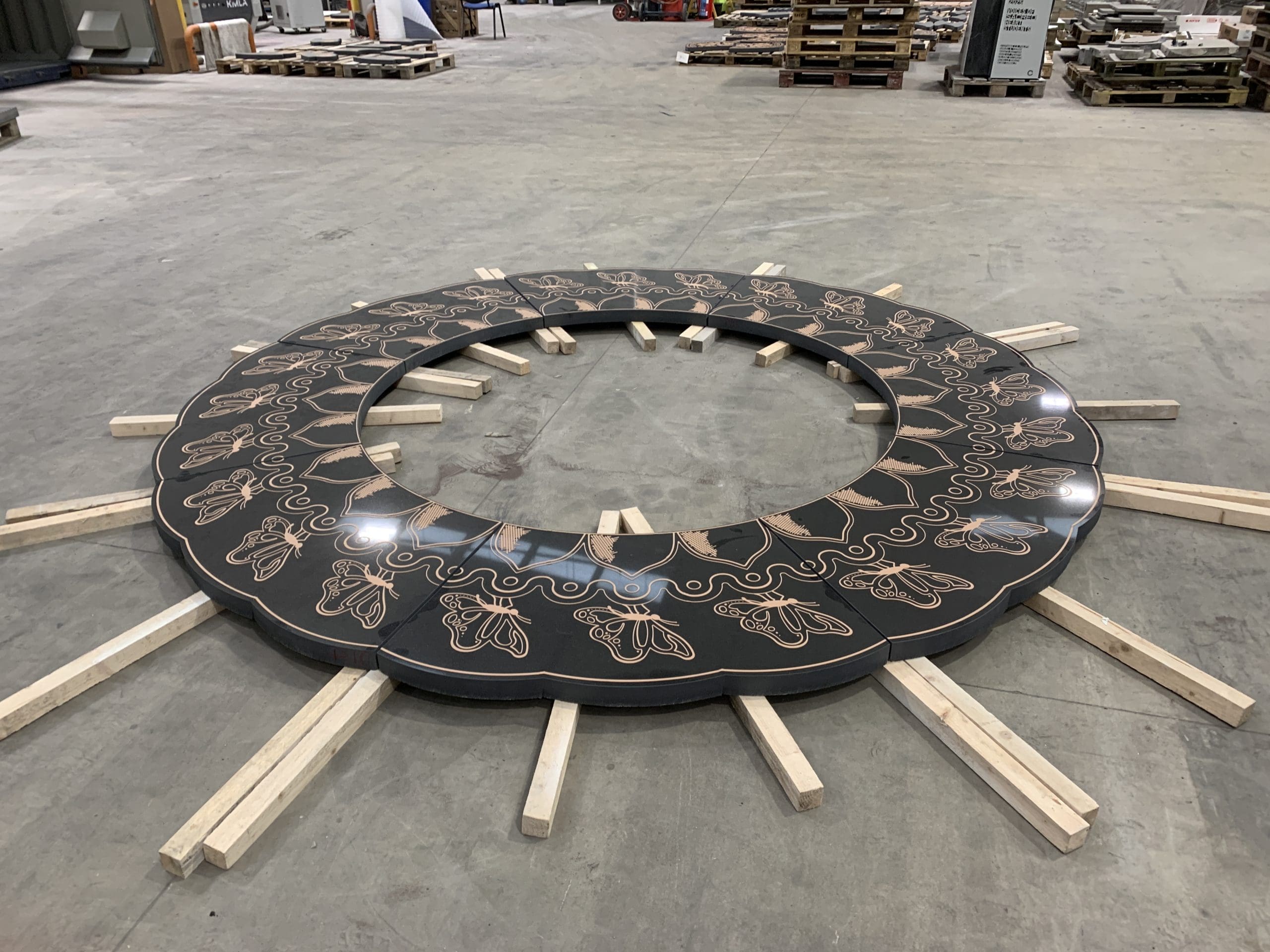 Hardscape Surfaces team developed full General Arrangement drawings for each section of the complex design, enabling meticulous planning of the layout, finishes and transitions. Skilled masons at our Hardscape Surfaces factory executed the design using a combination of Crystal Black and Royal White granites in polished, honed and sandblasted finishes. Stencil-based sandblasting highlighted intricate lines and patterns, creating the graphic contrast required by the design. Manufacturing and finish were supported by our CAD and production teams to ensure accuracy and continuity.