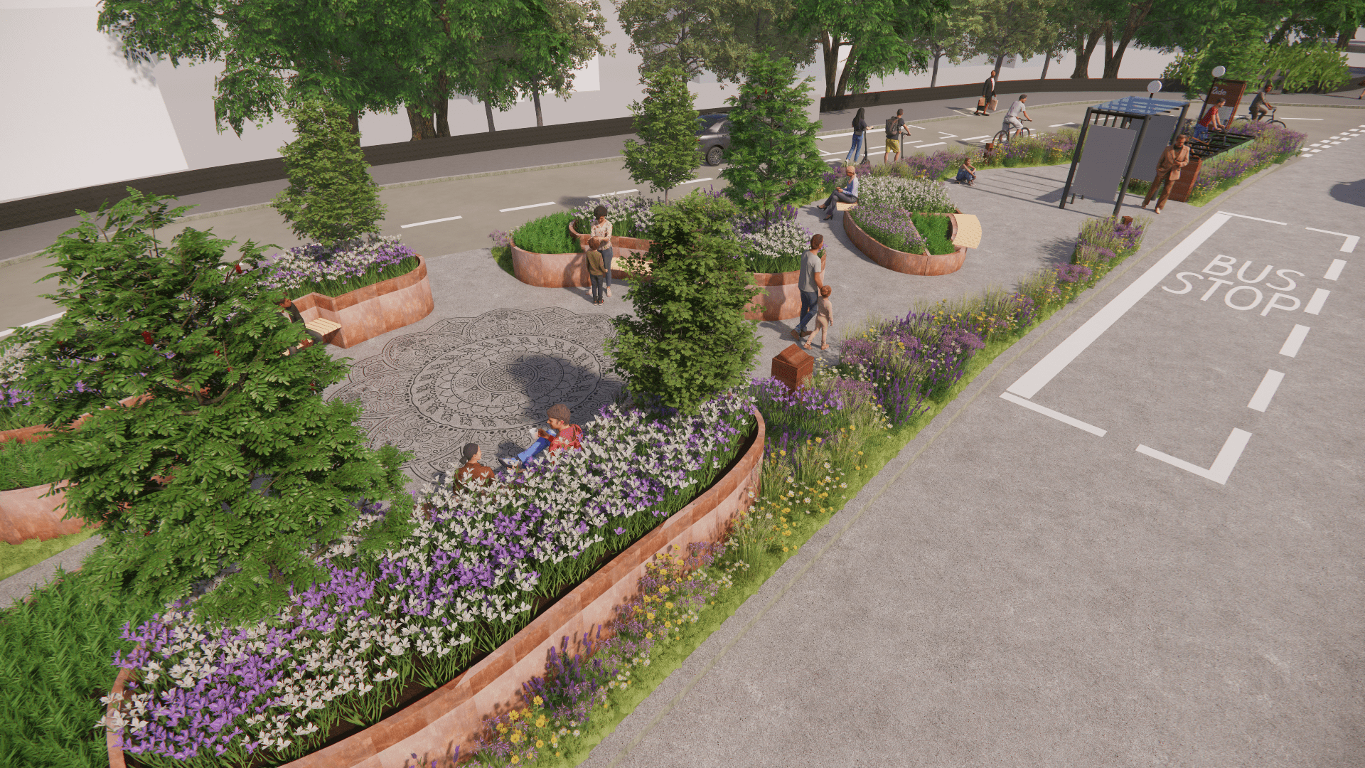At installation, the mural seamlessly integrates with the E-Hubs infrastructure, forming a bold visual anchor for the hub and celebrating Nottingham’s ambition for sustainable, connected urban mobility. The mural itself forms part of the Percy Street Mobility (E-Hubs) Hub and is intended to provide a welcoming, community-focused public space. It celebrates community, mobility and greening visually anchoring the hub and reflecting local identity (the pupils also helped with planting). The hub itself supports active and shared travel (e-bikes, e-scooters, EV charging, secure cycle parking, seating, landscaping).